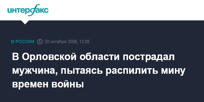 Москва. 20 октября. INTERFAX.RU - В Орловской области был ранен мужчина, который попытался разобрать мину времен Великой Отечественной войны, сообщили "Интерфаксу" в понедельник в пресс-службе УВД по региону.
