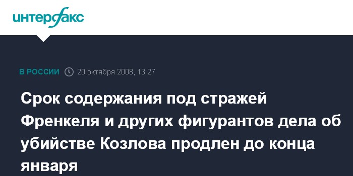 Москва. 20 октября. INTERFAX.RU - Мосгорсуд продлил до 24 января 2009 г. срок содержания под стражей банкира Алексея Френкеля и других обвиняемых в убийстве первого зампредседателя ЦБ РФ Андрея Козлова. Как сообщил "Интерфаксу" один из участников процесса, таким образом суд удовлетворил ходатайство стороны обвинения.