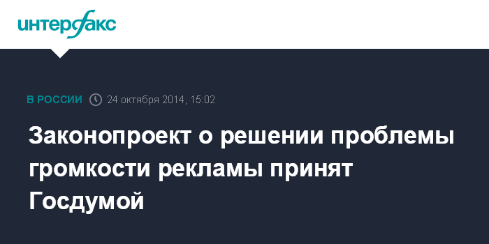 Москва. 24 октября. INTERFAX.RU - Госдума РФ в пятницу приняла во втором и сразу в третьем чтениях закон, направленный на решение проблемы несоответствия уровней громкости звука рекламы и прерываемых ею теле- и радиопрограмм.