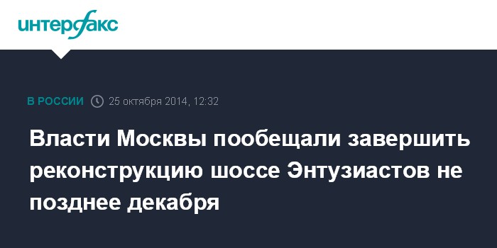 Москва. 25 октября. INTERFAX.RU - Реконструкция шоссе Энтузиастов может быть завершена в конце ноябре - в начале декабря текущего года, заявил заместитель мэра Москвы по вопросам градостроительной политики и строительства Марат Хуснуллин.