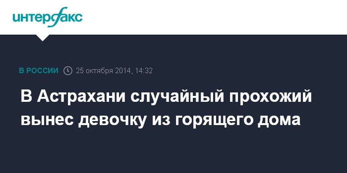 Москва. 25 октября. INTERFAX.RU - Девочка 2011 года рождения была спасена на пожаре в Астрахани, сообщила агентству "Интерфакс" руководитель пресс-службы Главного управления МЧС по Астраханской области Анжелика Баринова.