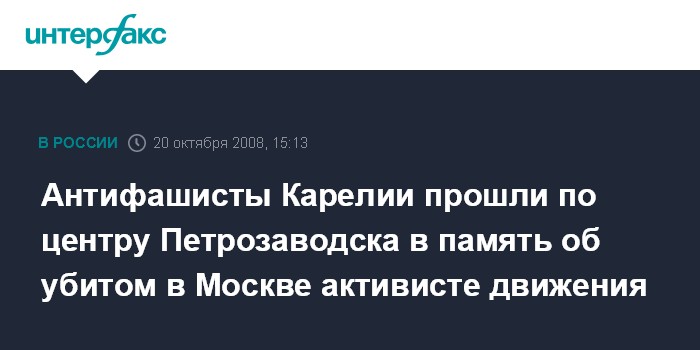 Москва. 20 октября. INTERFAX.RU – Антифашисты Петрозаводска почтили память убитого в Москве активиста движения Федора Филатова, пройдя шествием по центральной улице города.
