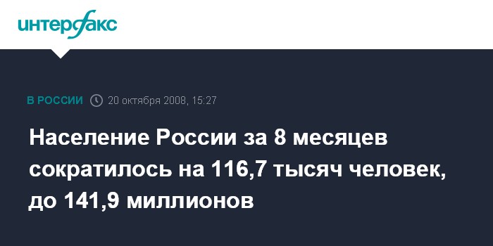 Москва. 20 октября. INTERFAX.RU – Численность населения России в течение января-августа 2008 года уменьшилась на 116,7 тыс. человек и составила к 1 сентября 141,9 млн человек, сообщила Федеральная служба государственной статистики (Росстат).