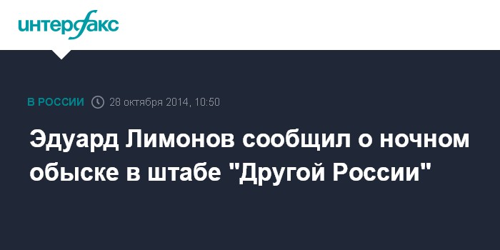 Москва. 28 октября. INTERFAX.RU - Лидер партии "Другая Россия" Эдуард Лимонов сообщил о повторном обыске в штабе партии. По словам Лимонова, первый обыск правоохранительными органами в штабе "Другой России" был проведен накануне вечером, ночью к оппозиционерам приехали с повторным обыском.