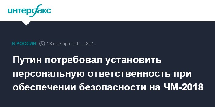 Москва. 28 октября. INTERFAX.RU - Президент России Владимир Путин потребовал четкого взаимодействия ведомств и обозначения персональной ответственности в обеспечении безопасности при проведении чемпионата мира по футболу в 2018 году в России.