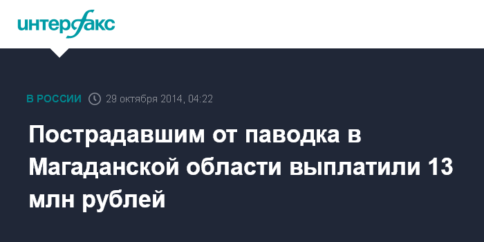 Москва. 29 октября. INTERFAX.RU - Жителям Магаданской области выплачено более 13 млн рублей материальной помощи на возмещение ущерба, который был нанесен в результате паводков в июле.