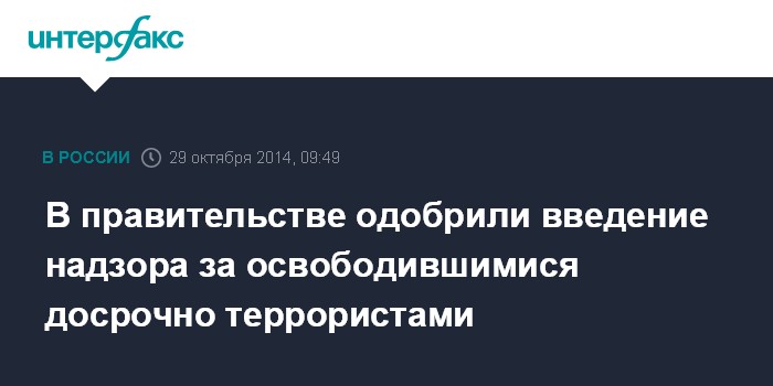 Москва. 29 октября. INTERFAX.RU - Комиссия правительства по законопроектной деятельности одобрила внесенный МВД России законопроект об административном надзоре за условно-досрочно освободившимися лицами, осужденными за совершение тяжких преступлений террористической и экстремистской направленности.