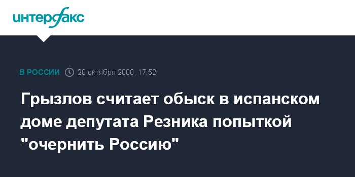 Москва. 20 октября. INTERFAX.RU - Председатель Госдумы Борис Грызлов заявил, что претензии со стороны испанского правосудия к главе думского комитета по финансовому рынку Владиславу Резнику не что иное, как провокация, цель которой - "очернить Россию".