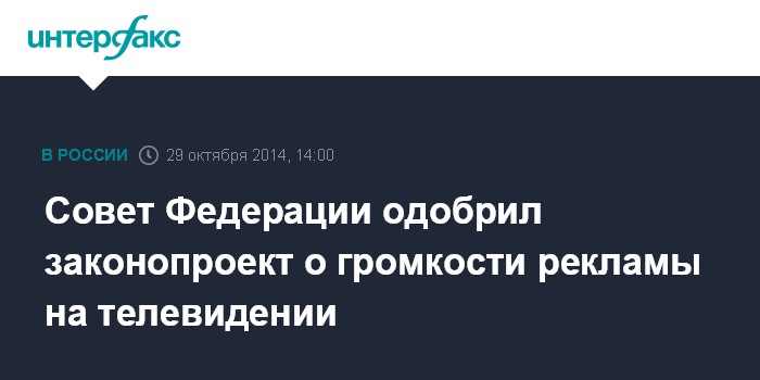 Москва. 29 октября. INTERFAX.RU - Совет Федерации одобрил в среду законопроект, направленный на решение проблемы несоответствия уровней громкости звука рекламы и прерываемых ею теле- и радиопрограмм.