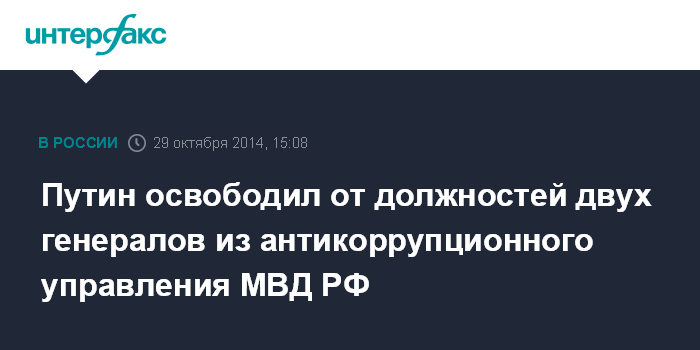 Москва. 29 октября. INTERFAX.RU - Президент РФ Владимир Путин произвел кадровые изменения в антикоррупционном управлении министерства внутренних дел РФ.