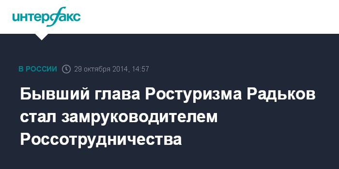 Москва. 29 октября. INTERFAX.RU - Президент РФ Владимир Путин назначил Александра Радькова, возглавлявшего ранее Ростуризм, заместителем руководителя Россотрудничества.