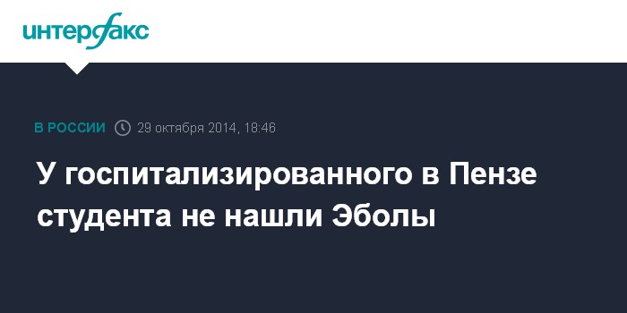 Москва. 29 октября. INTERFAX.RU - Подозрение на лихорадку Эбола у пензенского студента, доставленного в больницу с высокой температурой, не подтвердилось, сообщается на сайте минздрава Пензенской области в среду.