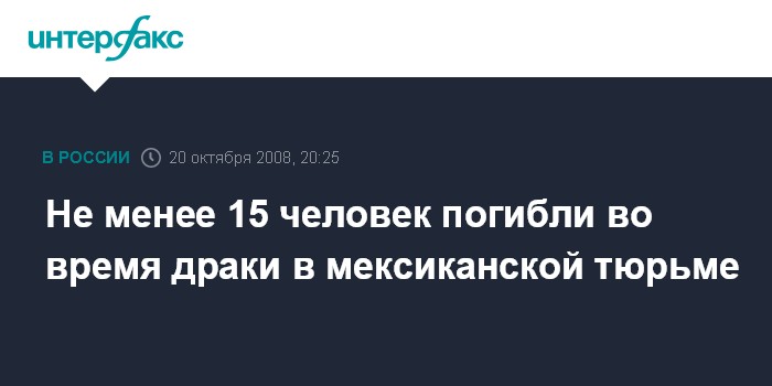 Москва. 20 октября. INTERFAX.RU - Не менее 15 человек погибли и 11 ранены во время драки между заключенными, произошедшей в тюрьме мексиканского города Рейноса, сообщают в понедельник местные власти.