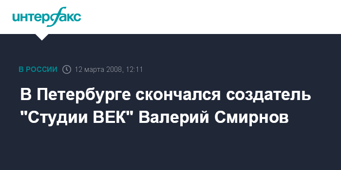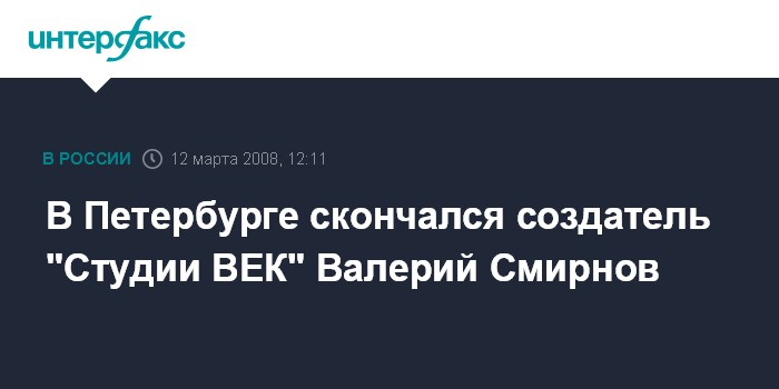 Санкт-Петербург. 12 марта. INTERFAX.RU - В Петербурге скончался известный режиссер художественного и документального кино Валерий Смирнов, сообщает в среду пресс-служба городского комитета по культуре.