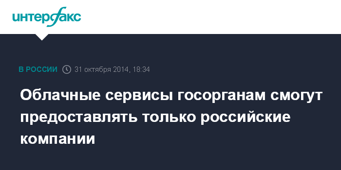 Москва. 31 октября. INTERFAX.RU - Предоставлением облачных сервисов российским органам власти смогут заниматься только российские облачные провайдеры, следует из проекта закона "О внесении изменений в закон об информации, информационных технологиях и о защите информации".