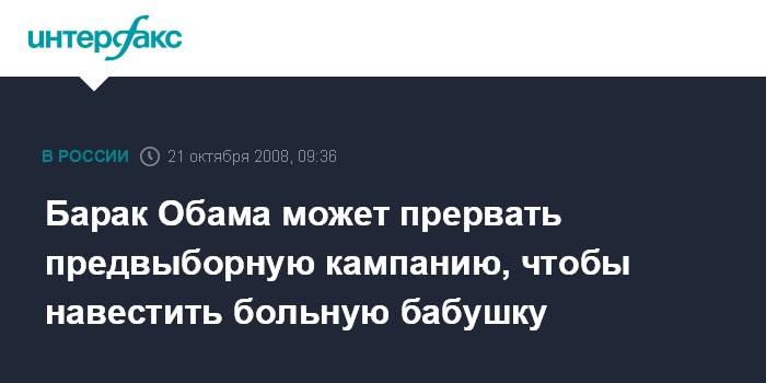 Москва. 21 октября. INTERFAX.RU - Кандидат на пост президента США сенатор-демократ Барак Обама сделает перерыв в своей избирательной кампании в четверг, чтобы навестить больную бабушку, передает телеканал Си-Эн-Эн слова представителя кандидата.
