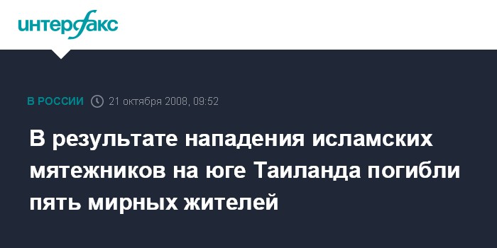 Москва. 21 октября. INTERFAX.RU - В результате нападения предполагаемых исламских мятежников на юге Таиланда пять местных жителей были убиты и еще шестеро ранены, сообщает полиция страны.