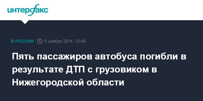 Москва. 5 ноября. INTERFAX.RU - Пассажирский автобус столкнулся с грузовиком в Навашинском районе Нижегородской области в среду, погибли пять человек, сообщили "Интерфакс-Поволжье" в пресс-службе регионального УГИБДД.