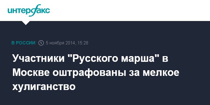 Москва. 5 ноября. INTERFAX.RU - Люблинский суд Москвы назначил наказание в виде штрафа в размере 1000 рублей четырем задержанным в ходе "Русского марша", признав их виновными в мелком хулиганстве.