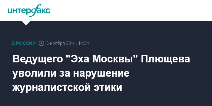 Москва. 6 ноября. INTERFAX.RU - Ведущий "Эха Москвы" Александр Плющев уволен с радиостанции, говорится в сообщении холдинга "Газпром-Медиа", поступившем в распоряжение "Интерфакса" в четверг.