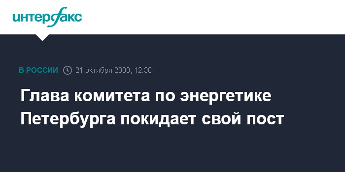 Москва. 21 октября. INTERFAX.RU - Председатель комитета по энергетике и инженерному обеспечению Петербурга Александр Бобров покидает свой пост, сообщила на очередном заседании во вторник губернатор города Валентина Матвиенко.