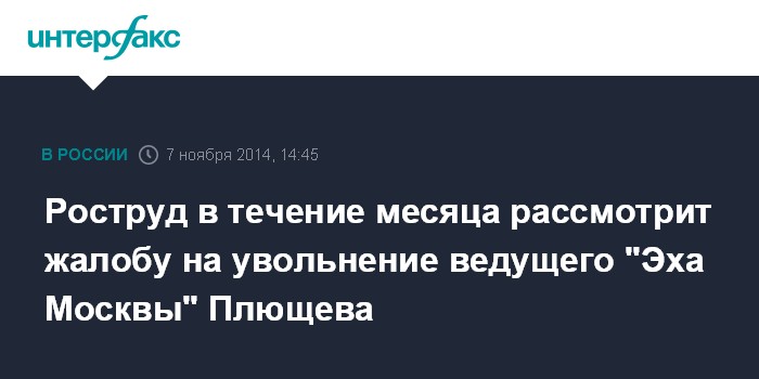 Москва. 7 ноября. INTERFAX.RU - Роструд начал проверку выполнения трудового законодательства РФ руководством радиостанции "Эхо Москвы" в связи с увольнением ведущего Александра Плющева, сообщил в пятницу представитель ведомства.