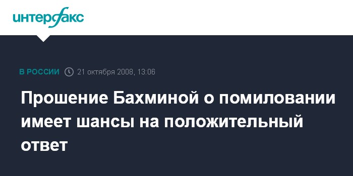 Москва. 21 октября. INTERFAX.RU - Прошение о помиловании бывшего юриста "ЮКОСа" Светланы Бахминой может быть удовлетворено, считает хорошо информированный источник в российских властных структурах. "Шансы на возможность положительного решения со стороны президента - оптимистические. Думаю, просьба будет удовлетворена, но окончательное слово, естественно, за главой государства", - заявил источник во вторник "Интерфаксу".