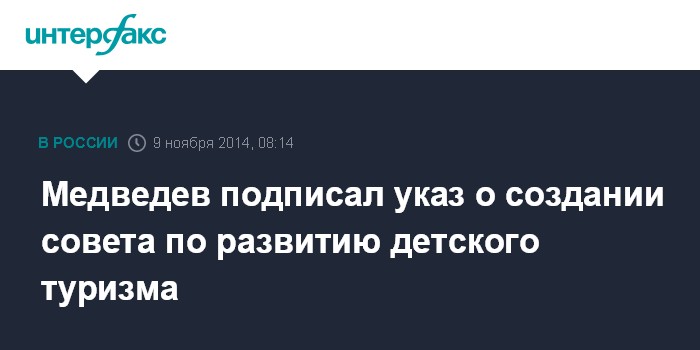 Москва. 9 ноября. INTERFAX.RU - Премьер-министр РФ Дмитрий Медведев подписал правительственное распоряжение о создании координационного совета по развитию детского туризма в России. Об этом сообщается в пресс-релизе на сайте правительства.