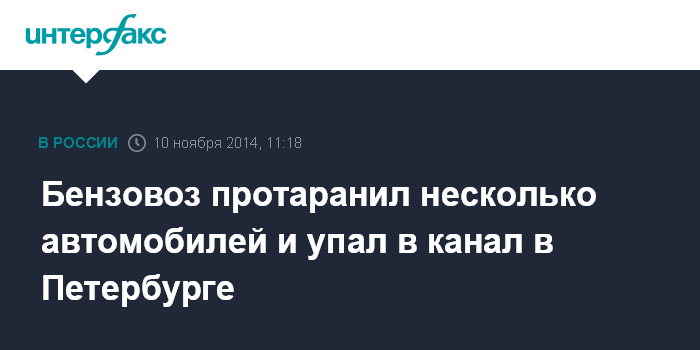 Москва. 10 ноября. INTERFAX.RU - Авария с участием бензовоза произошла в районе набережной Обводного канала в Петербурге. Перед падением в канал грузовик повредил десять автомобилей и протаранил ограждение на набережной.