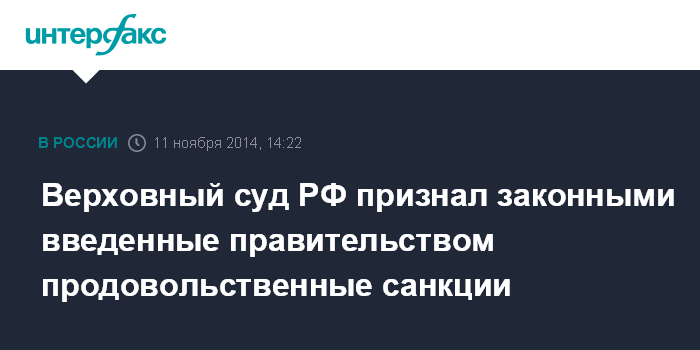 Москва. 11 ноября. INTERFAX.RU - Верховный суд России признал законным введение правительством России продовольственных санкций. Об этом говорится в постановлении Верховного суда РФ, оглашенном во вторник.