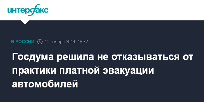 Москва. 11 ноября. INTERFAX.RU - Госдума во вторник при рассмотрении в первом чтении отклонила проект закона, подразумевающий полный отказ от платной эвакуации транспортных средств