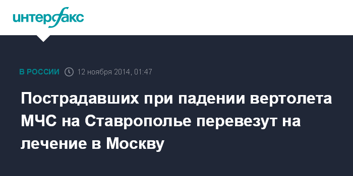 Москва. 12 ноября. INTERFAX.RU - Самолеты с врачами и специалистами для расследования инцидента с вертолетом МЧС и помощи во время транспортировки пострадавших прибудут в Минеральные Воды, сообщает Северо-Кавказский региональный центр МЧС.