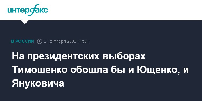 Киев. 21 октября. INTERFAX.RU - В случае проведения президентских выборов на Украине в ближайшее воскресение лидером президентской гонки стала бы премьер Юлия Тимошенко, за ней следуют лидер Партии регионов Виктор Янукович и президент Виктор Ющенко.