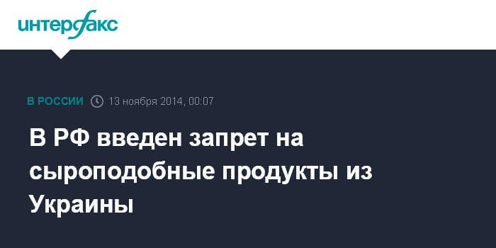 "Роспотребнадзор приостановил с 13.11.2014 ввоз на территорию Российской Федерации сыроподобных продуктов производства Украины (коды ТН ВЭД 1516 и 1517). Соответствующая информация направлена в Федеральную таможенную службу и управления Роспотребнадзора по субъектам РФ", - говорится в сообщении Роспотребнадзора.
