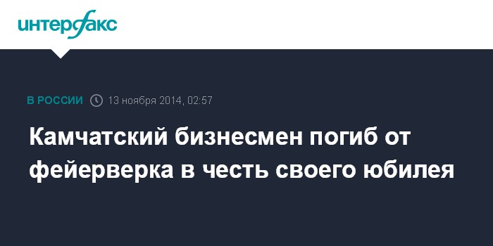 Москва. 13 ноября. INTERFAX.RU - Директор местной фирмы погиб поздно вечером в среду на базе отдыха "Лесная" в Елизовском районе Камчатского края, запуская фейерверки во время празднования своего 35-летия. Об этом сообщила агентству "Интерфакс" старший помощник руководителя СУ СК РФ по региону Елена Матафонова.