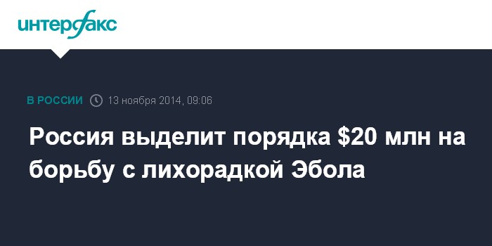 Москва. 13 ноября. INTERFAX.RU - Россия выделяет около 20 миллионов долларов на борьбу с лихорадкой Эбола, сообщил премьер-министр РФ Дмитрий Медведев, выступая на заседании Восточноазиатского саммита.