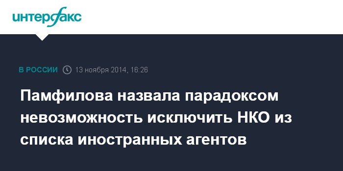 Москва. 13 ноября. INTERFAX.RU - Уполномоченный по правам человека в России Элла Памфилова назвала ненормальным то, что в России нет механизма исключения некоммерческих организаций из реестра иностранных агентов.