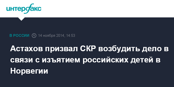 Москва. 14 ноября. INTERFAX.RU - Уполномоченный при президенте РФ по правам ребенка Павел Астахов высказался за возбуждение уголовного дела по фактам изъятия российских детей в Норвегии.