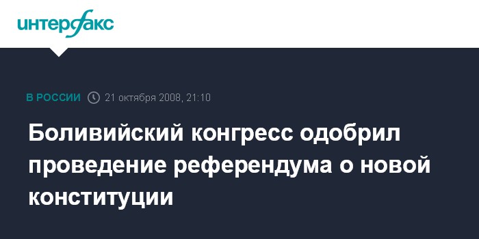 Москва. 21 октября. INTERFAX.RU - Национальный конгресс Боливии одобрил во вторник предложение об организации общенационального референдума по проекту новой конституции страны.