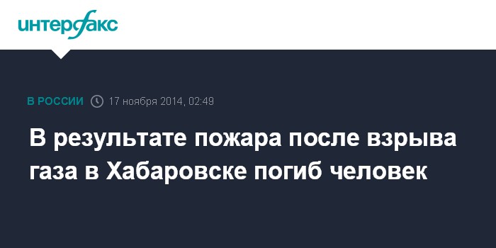 Москва. 17 ноября. INTERFAX.RU - В пятиэтажном доме по ул. Воровского в Хабаровске произошел взрыв бытового газа, в результате чего погибла женщина; пожар ликвидировали почти за 20 минут. Об этом "Интерфаксу" сообщили в местном ГУ МЧС.