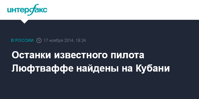 Москва. 17 ноября. INTERFAX.RU - Поисковики на Кубани обнаружили на месте крушения пикирующего бомбардировщика Ю-87 останки немецкого летчика Хорста Шиллера, который в сентябре 1939 года сбросил первые бомбы на Польшу, сообщил руководителя поисковой организации "Кубанский плацдарм" Евгений Порфирьев.