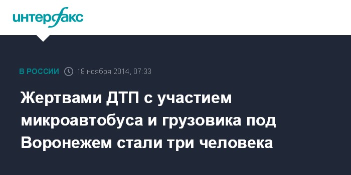 Москва. 18 ноября. INTERFAX.RU - Автоавария с участием пассажирского микроавтобуса в Воронежской области, по предварительным данным, унесла жизни трех человек, сообщил "Интерфаксу" источник в службе скорой помощи региона.