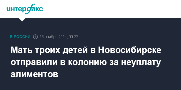 Москва. 18 ноября. INTERFAX.RU - Суд в Новосибирске признал мать троих несовершеннолетних детей виновной в уклонении от уплаты алиментов в размере почти 900 тыс. рублей и приговорил ее к девяти месяцам лишения свободы, сообщает УФССП по региону.