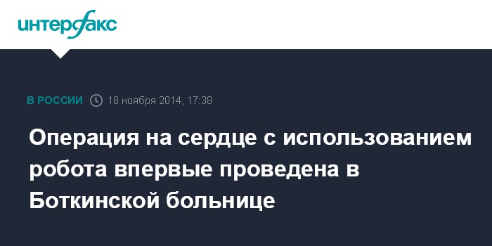 Москва. 18 ноября. INTERFAX.RU - Операция на сердце с использованием хирургического робота Da Vinci впервые проведена в Боткинской больнице, сообщил "Интерфаксу" во вторник руководитель столичного департамента здравоохранения Алексей Хрипун.