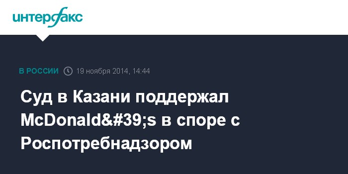 Москва. 19 ноября. INTERFAX.RU - Арбитражный суд Татарстана в среду полностью удовлетворил иск ООО "Макдоналдс" (Москва) о признании незаконным одного из пунктов предписания местного Роспотребнадзора, касающегося кухонного оборудования ресторана сети в Казани, следует из опубликованных материалов суда.