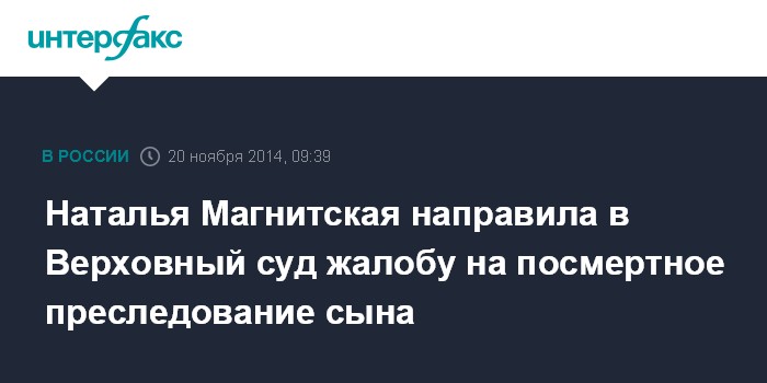 Москва. 20 ноября. INTERFAX.RU - Мать сотрудника фонда Hermitage Capital Сергея Магнитского Наталья добивается в Верховном суде отмены посмертных обвинений своего сына в хищении более 5 млрд рублей, сообщили в пресс-службе компании.