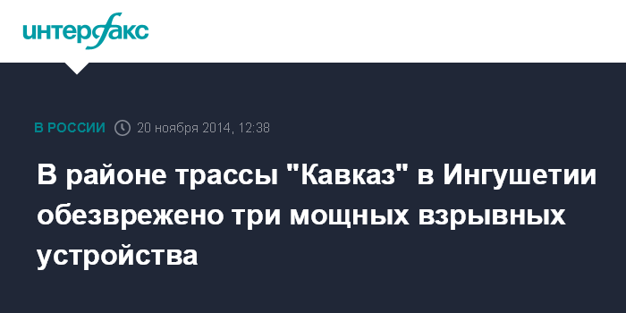 Москва. 20 ноября. INTERFAX.RU - В Ингушетии в районе федеральной автодороги "Кавказ" обнаружено и обезврежено три мощных самодельных взрывных устройства, сообщил агентству "Интерфакс" источник в правоохранительных органах.