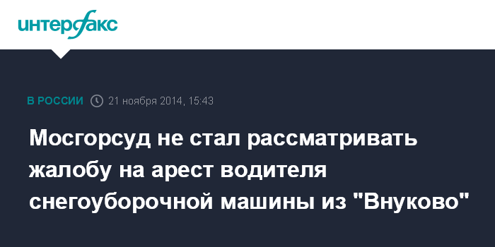 Мосгорсуд не стал рассматривать жалобу на арест водителя снегоуборочной машины из "Внуково"