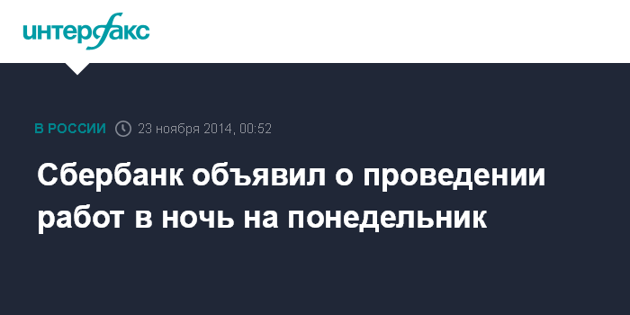 Москва. 23 ноября. INTERFAX.RU - Сбербанк России планирует проведение технологических работ в вычислительном комплексе 24 ноября в период с 00:00 мск до 03:00 по московскому времени, говорится в сообщении банка.
