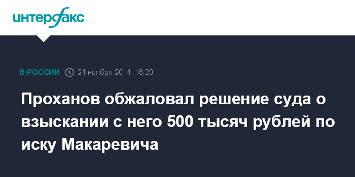 Ранее Савеловский суд Москвы взыскал с Проханова 500 тысяч рублей по иску о защите чести и достоинства, заявленному Макаревичем. Поводом для иска послужила статья в газете "Известия", в которой утверждается, что музыкант выступал перед украинскими военнослужащими в Славянске.